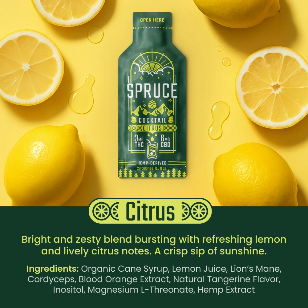 Spruce Citrus cocktail is a blend of real fruit extract, organic cane sugar in a pocketable concentrated pouch. When you're ready for euphoric social lubricant just rip and pour into 8-12 oz of your plain seltzer or club soda.