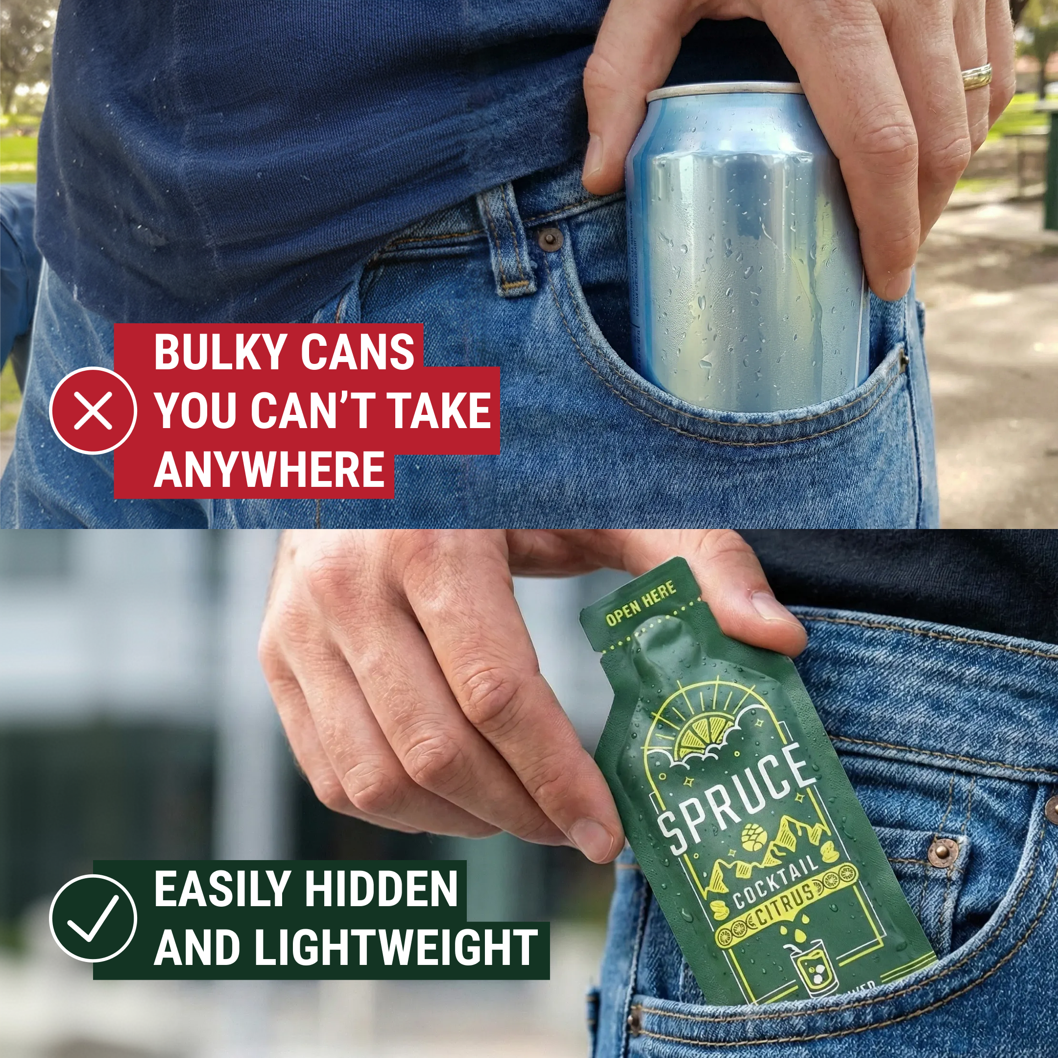 Travelling with cans isn’t simple if you’re flying.. Spruce comes in small, discreet packets that fit anywhere. It’s simple to take anywhere without anyone noticing, including airports, clubs, restaurants and bars.