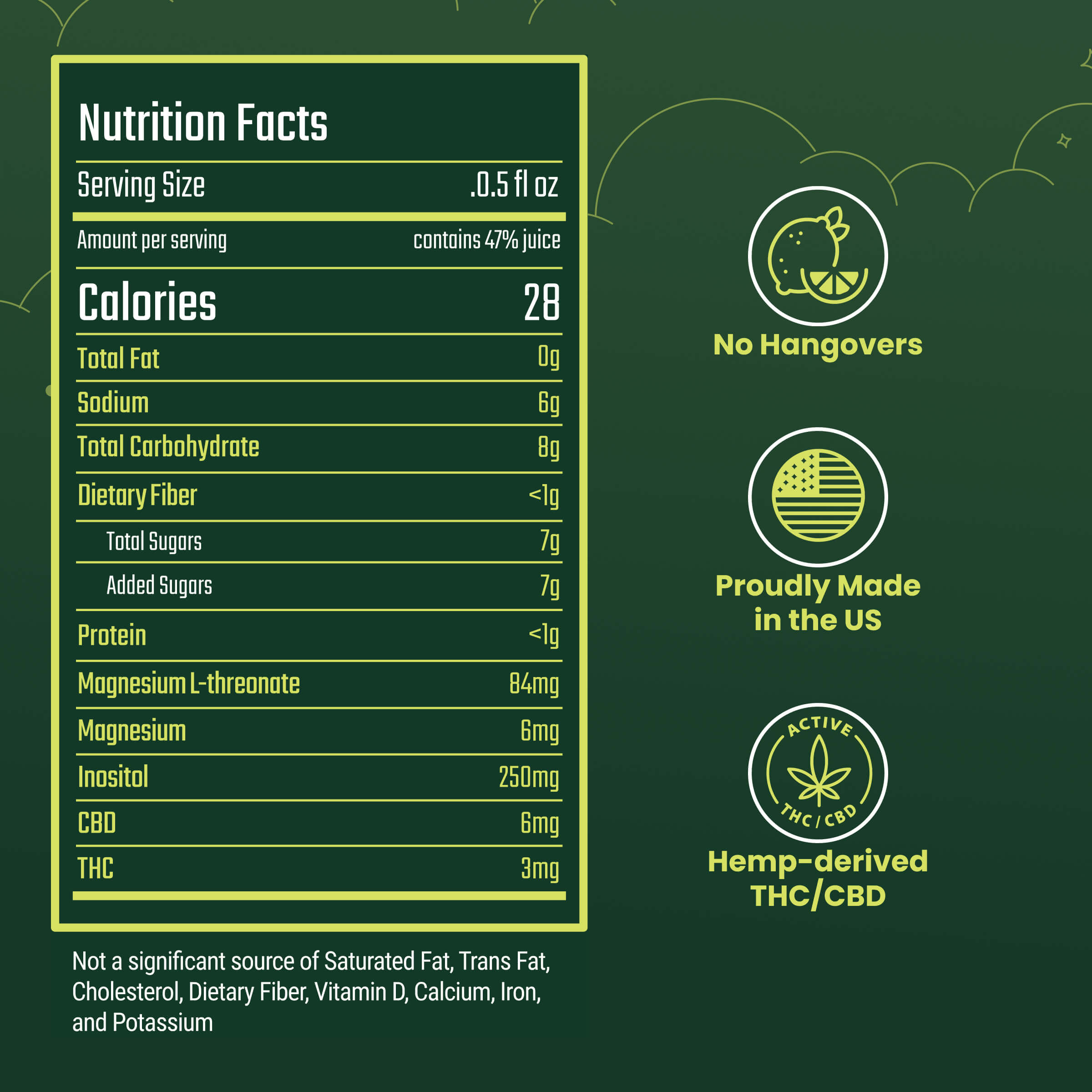 Cane Syrup, Lemon Juice, Raspberry Extract, Hemp Extract, Inositol, Peach Extract, Mango Extract, Magnesium L-Threonate